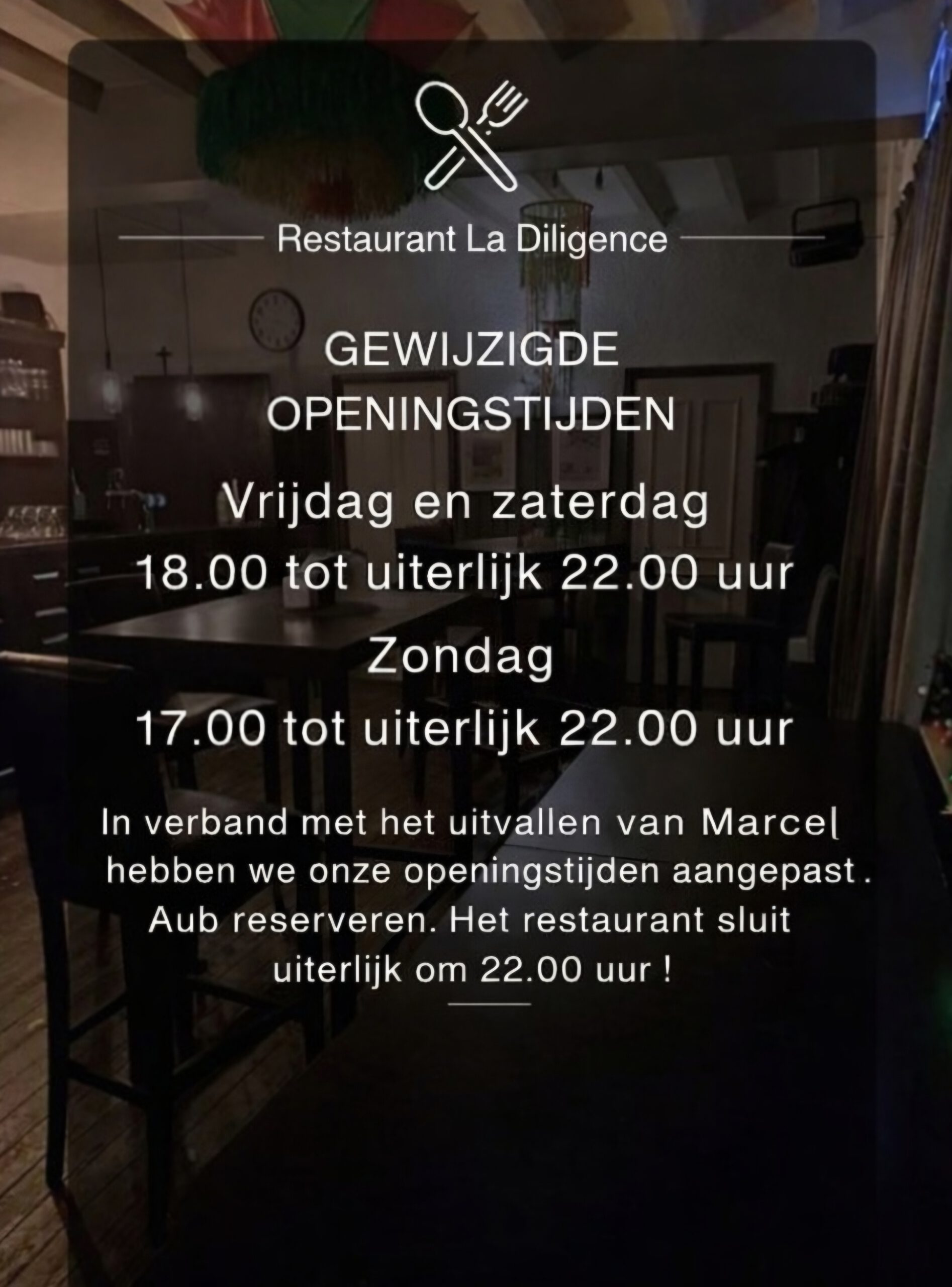 Of stuur een email naar eten@ladiligenceherkenbosch.nl Indien u geen bevestiging krijgt dient u telefonisch te reserveren.